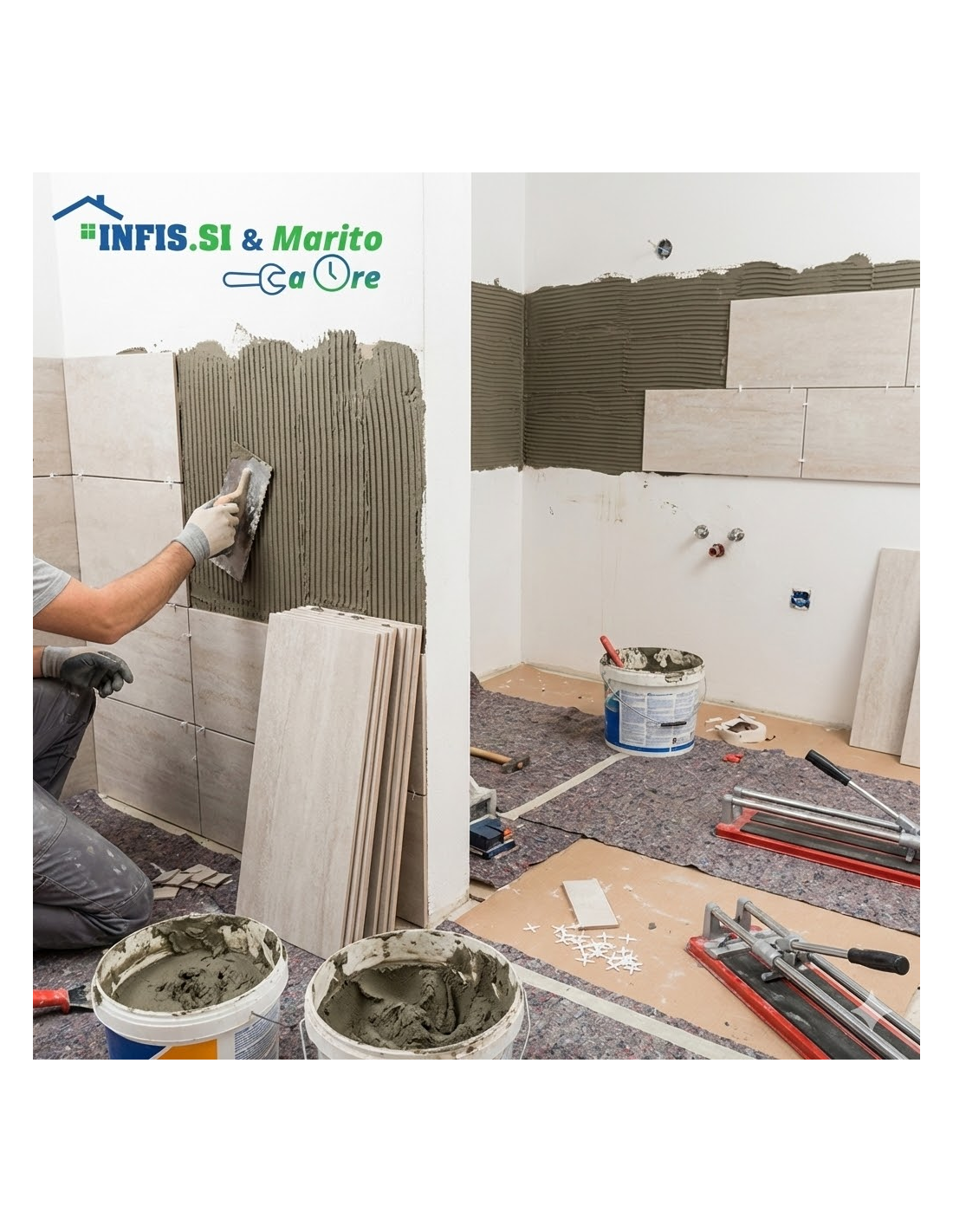 • Materiali di Consumo: Piastrelle, colla, stucco (fugante), distanziatori a cuneo, silicone e profili jolly (angolari) sono a carico del cliente.